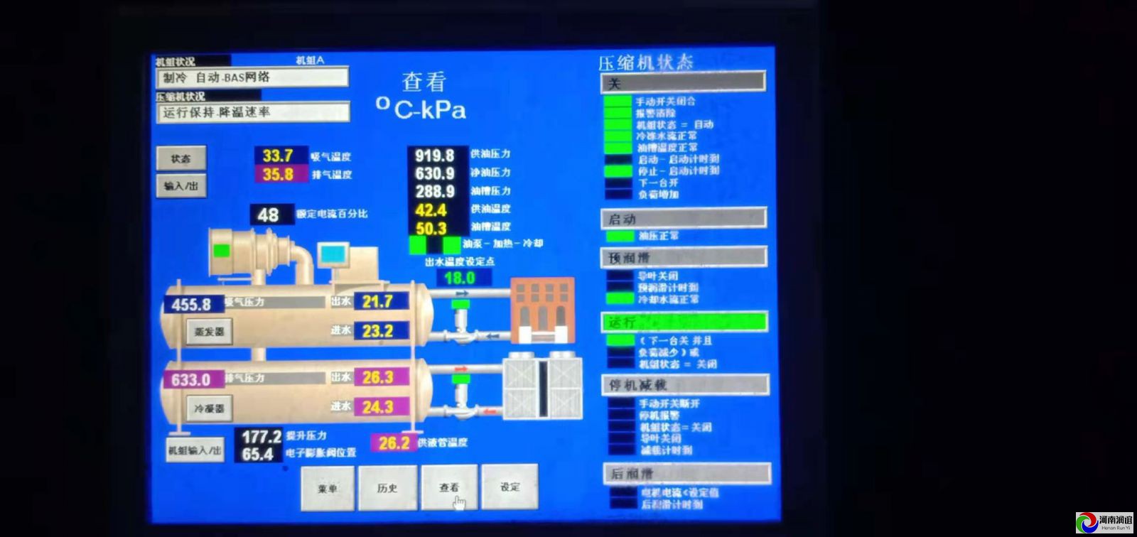 美的離心式中央空調機組啟動前檢查 按下列項目進行制冷機啟動前的操作確認: (1)油箱內油位正確最高油位視液鏡中部附近。 (2)油溫正確機組初次安裝投運前或機組長期斷電、
